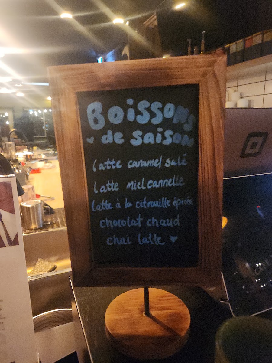 Beverages include a selection of hot drinks such as thé, chocolat chaud, matcha, London fog, and chai. There are also lighter options like breuvages and bottled water, covering a range of preferences and needs.